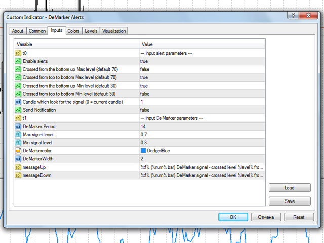 You can avoid constant monitoring of computer screen waiting for the DeMarker signal while receiving push notifications to a mobile terminal or a sound alert on the screen about all required events, by using this indicator - DeMarker Alerts. In fact, it is the replacement of the standard indicator with which you will never miss the oscillator signals.
