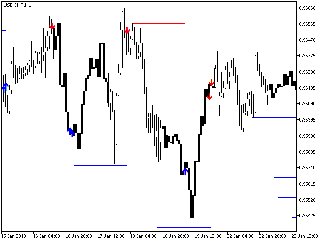 The indicator takes the High and Low of the price over the specified period - 24 bars by default (can be changed). Then, if on the previous candle, the price broke the High or Low level and the new candle opened higher than the extremums, then a signal will be generated on the zero candle and an arrow for entering a deal (reversal) is drawn, while the extremum levels are marked with lines on the chart.