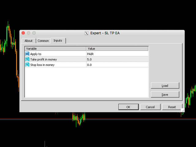 This is a simple risk/reward setter. You enter your TP and SL in the currency amount and it sets it for you, you set your targets in money (not in pips), it helps beginners who are still learning about risk/reward ratios to set their risk/reward based on their capital or amount of money. For example, if you want to risk $3 to make $10, you just fill it in and it sets your order targets accordingly.