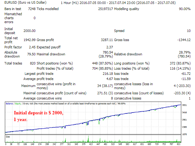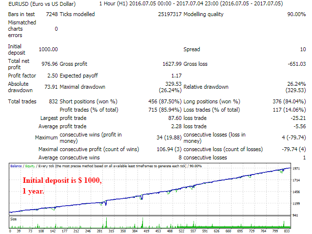 The default parameters are optimized to trade with the minimal risk on EURUSD H1. The EA was tested with the specified parameters using Alpari real account quotes. Testing showed that the trading robot can start working with the minimum starting deposit of 100$, with a profit of 100% per year in testing. Use of a higher deposit and of the initial lot may proportionally increase profitability. There is potential for its expansion by a simple optimization of some of its parameters.
