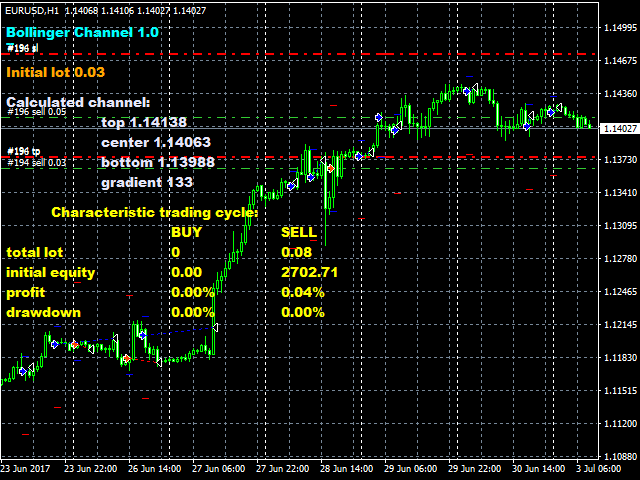 The robot calculates the channel formed by Bollinger bands. Market entries will be made near the channel borders if there is a sufficient gradient. Profit is fixed on the opposite side of the channel. Since the deals are only opened in the trend direction, the EA tries to close the majority of deals with profit. Losing positions are averaged using additional deals, which are calculated so that their aggregate sum could also be closed with profit. As the deposit grows, the money management is applied to increase the volume of trades to match returns and risk with available funds. Robot testing and use are demonstrated in the video .