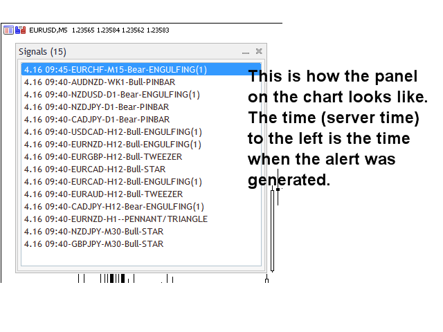 请注意,由于具有多功能性,既不会在安装指标的图表上绘制买卖建议,也不会绘制线条和箭头。 指向内柱和三角旗形以及其他蜡烛形态的箭头的线条将绘制在图表上,当您单击图表面板中的信号时,图表会打开。