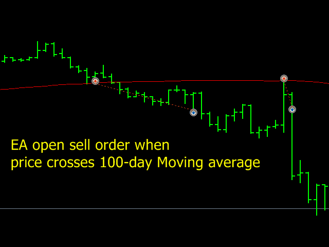 - The EA opens a sell order when price crosses 100-day moving average below.