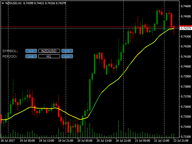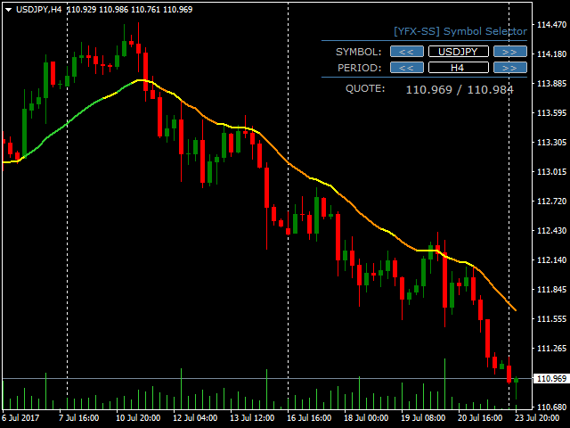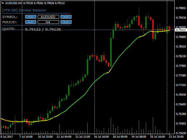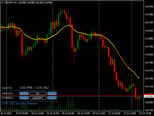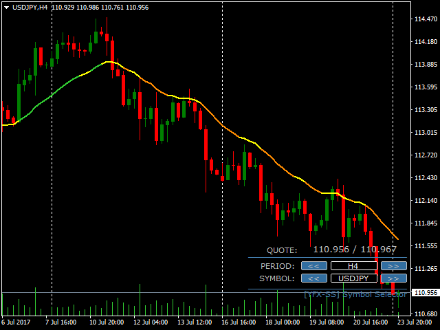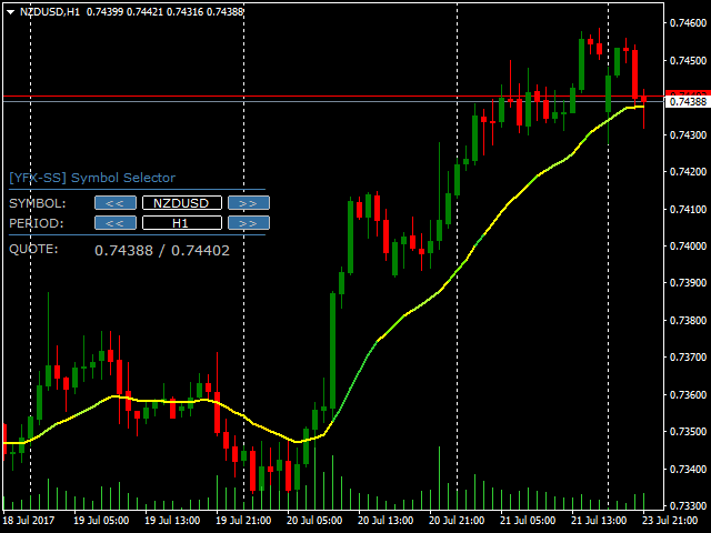 The YFX Symbol Selector indicator is used to easily change the chart symbol and period with a click of a button. This is done by using a selector GUI object that can be placed on any corner of the chart. The GUI selector contains the following information: