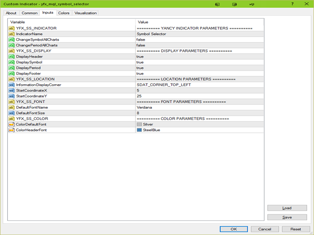 - IndicatorName : “Symbol Selector” – Name of the indicator that is included in the name displayed in the data window and also in the GUI selector panel header.
