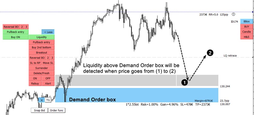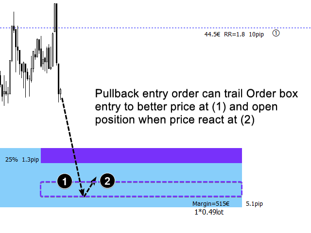 Order box is rectangle which defines market order with entry and stop loss price (virtual market order). Order box will calculate lot size for every order, total stop loss, risk and gain percentage, total profit from all targets. Commission and spread are included in all calculations. TBOM helps trader to be more fast and efficient. It also protects trader before unfavorable market conditions like opening gaps, news spikes and huge spread. It offers a lot of different price notifications and price action automation tools.