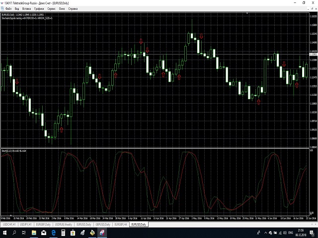 The script draws an up arrow when the Stochastic Oscillator lines go out of the oversold zone.