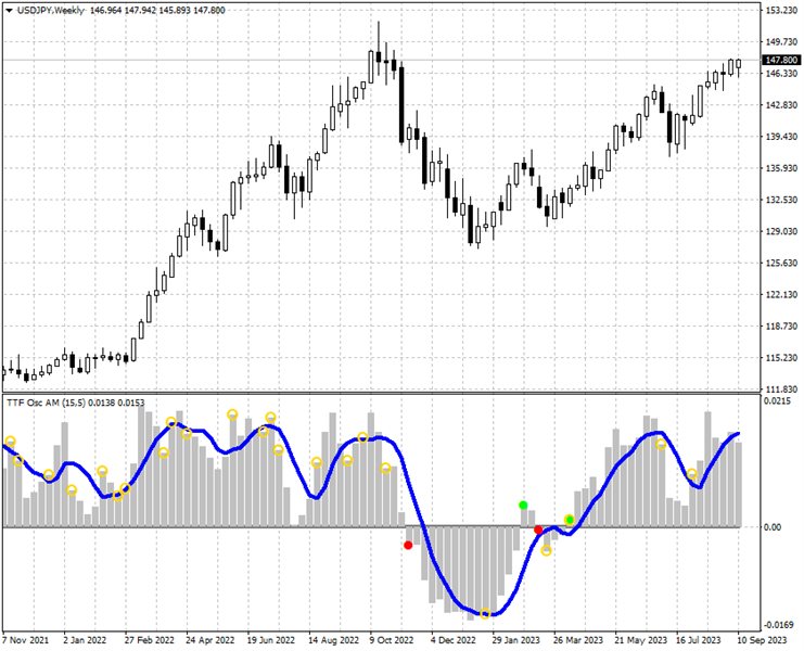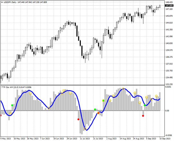 If the TTF oscillator crosses its smoothed value, it is a signal of a trend change.