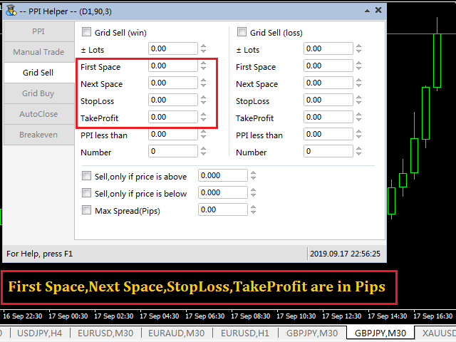 EA的界面,包含了6个标签页,且提供了 中文界面 ,分别是 PPI ,手工交易,空单网格,多单网格,自动平仓,平保