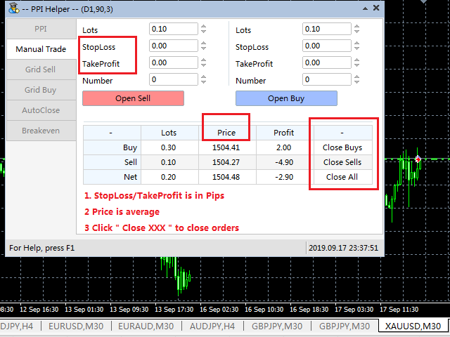 - 手工交易 -- 点击按钮,手工开空单,多单,可设置手数,止损,止盈。