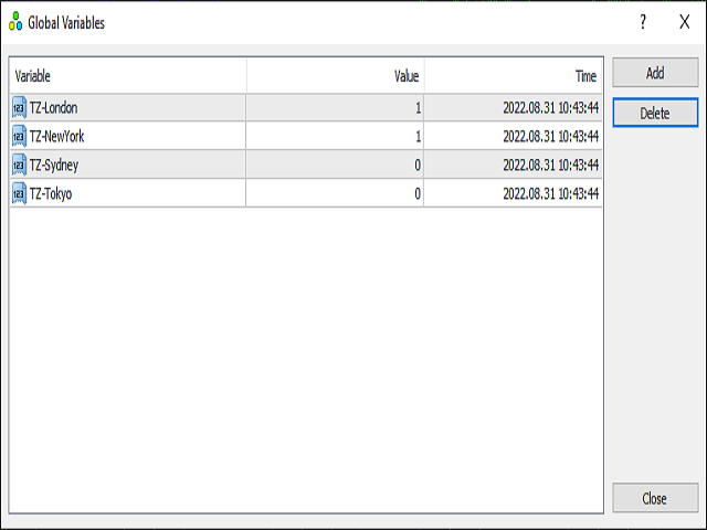該指標將顯示活躍和不活躍的交易時段,並將全局變量設置為交易時段是活躍的 (1) 還是不活躍的 (0)。