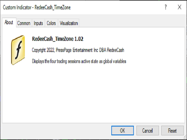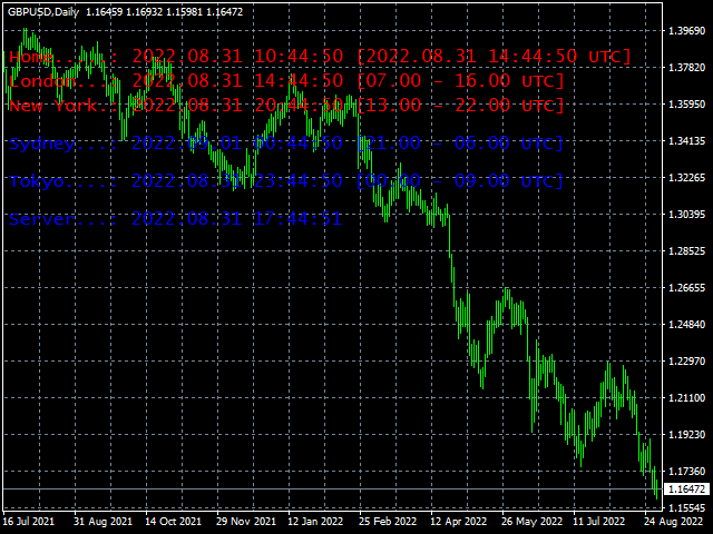 // 調用自定義指標 iCustom(Symbol(),PERIOD_D1,"Market/RedeeCash_TimeZone",0,0,Blue,Red); // 獲取全局變量的值 double NewYorkSessionIsActive = GlobalVariableGet("TZ-NewYork"); double LondonSessionIsActive = GlobalVariableGet("TZ-London"); double SydneySessionIsActive = GlobalVariableGet("TZ-Sydney"); double TokyoSessionIsActive = GlobalVariableGet("TZ-Tokyo");交易時段顯示 UTC 時間,其操作範圍在括號中。 HOME 時間指示器顯示本地機器時間,括號中為當前 UTC 時間。 服務器時間顯示代理服務器時間。 HOME 和 SERVER 均顯示為藍色,顏色不變。
