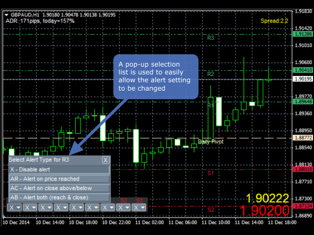 The product draws lines on the chart to show daily support, resistance and pivot plus weekly and monthly pivot. An alert can be set when the price reaches one of the lines or the price closes above/below it. This can be useful for both entry and exit. The alerts can be controlled interactively directly from the chart.