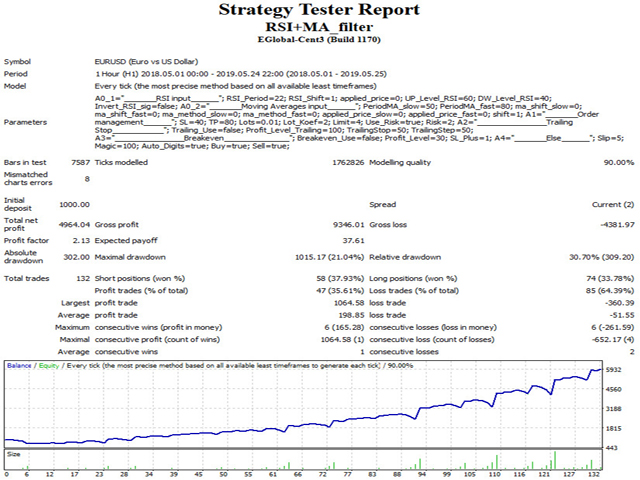Советник "RSI and MA filter" торгует по индикатору RSI, использует фильтр в качестве двух средних скользящих (быстрая MA выше медленной MA - покупка, продажа - наоборот), по желанию Пользователя применяется мартингейл (количество умножения лота при серии убытков ограничивается), безубыток, трейлинг стоп, инвертирование сигнала.