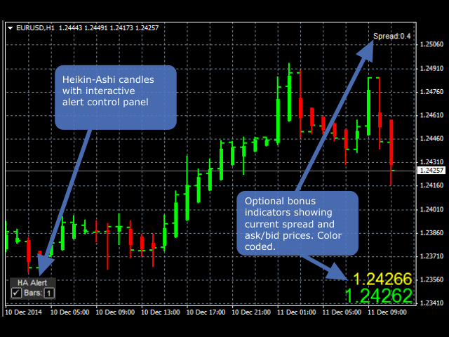 Shows Heikin-Ashi candles (often misspelled Heiken-Ashi) on the chart and can alert when candles change color. The alert is useful for both entry and exit. The number of candles of the new color before an alert is raised can be set. The alert can be controlled interactively, directly from the chart.