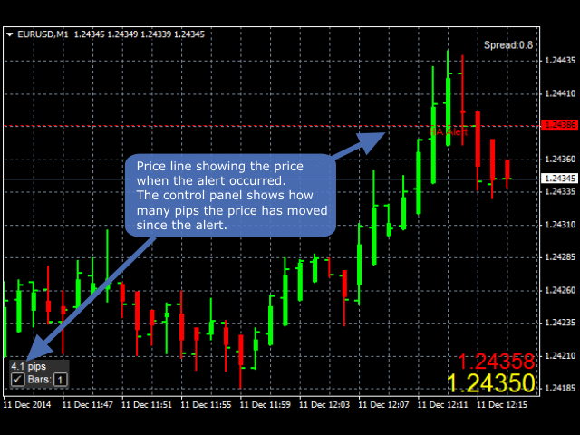 The indicator will show a small control panel on chart to allow the alert to be turned on and off, just click the check box with your mouse. The control panel also allows setting of the number of closed candles required, in the new color, before the alert is raised. Simply type the required number into the box. When an alert is raised the indicator will draw a horizontal line at the price and the control panel will show how many pips the market has moved since the alert. This is useful to know if you have taken too long to make a trade decision.