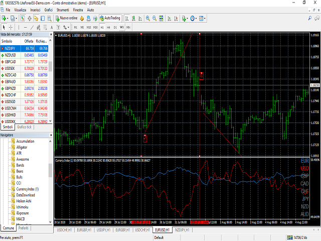 IMPORTANT - when all currencies are represented simultaneously on the chart, the calculation method used is to represent the EUR index in a less volatile way than the others.