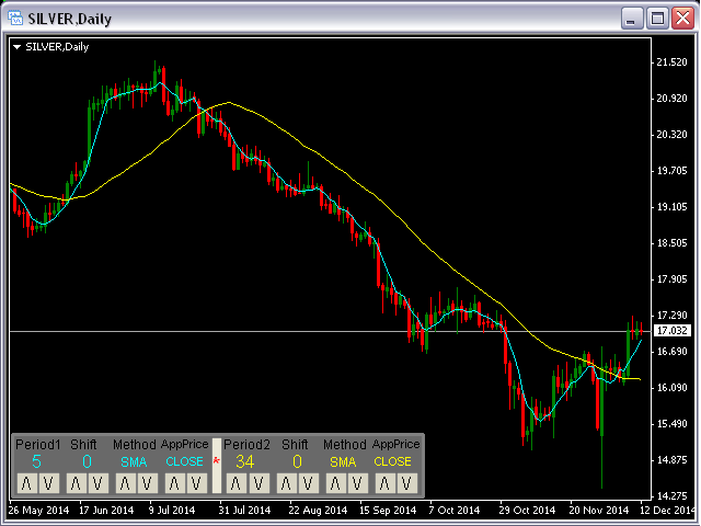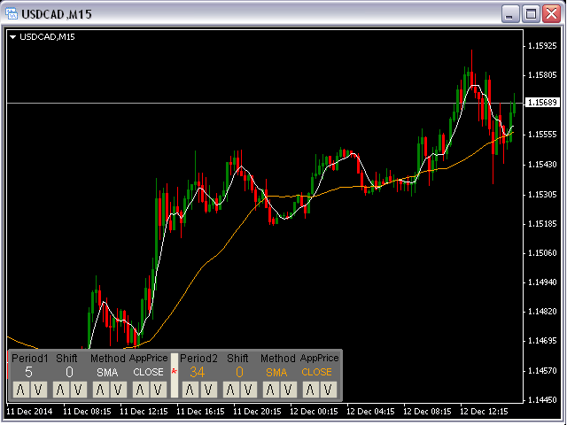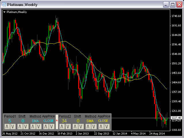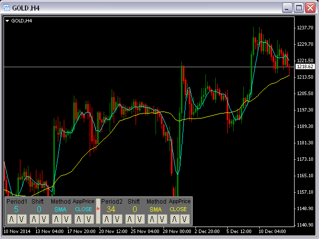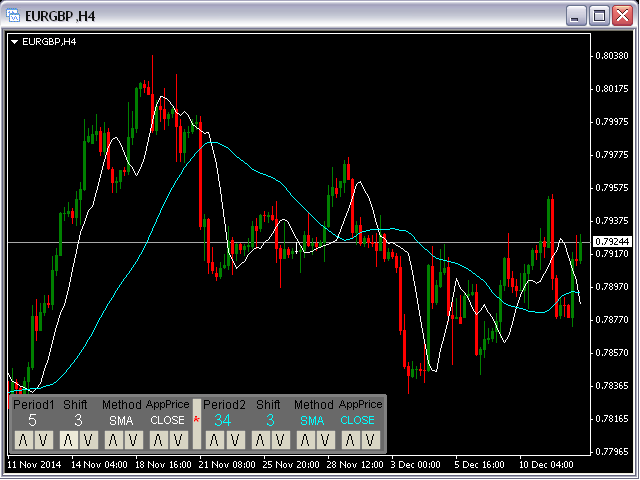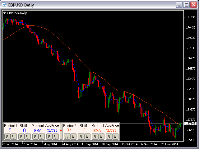 This panel will be very useful for a research of a trading strategy system. The MA-ControlPanel is based on the very popular Moving Averages indicator. You will be able to change the indicator parameters: Period , Shift , Method and Apply Price by clicking on the Up ( /\ ) and Down ( \/ ) buttons. You may choose your favorite colors using parameters BackGround, maColor1 and maColor2.