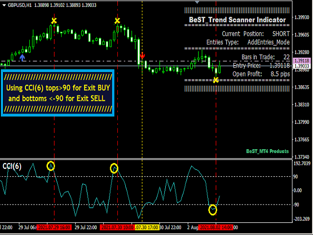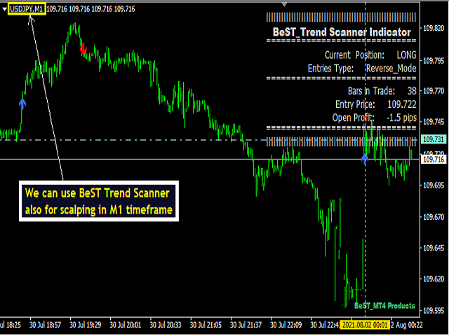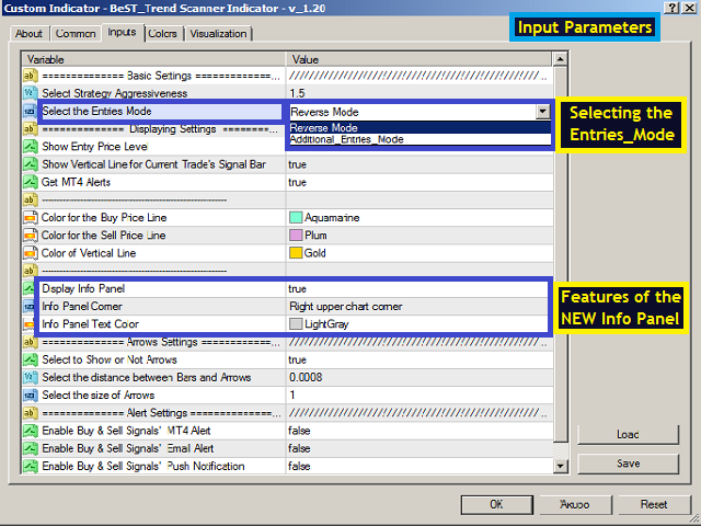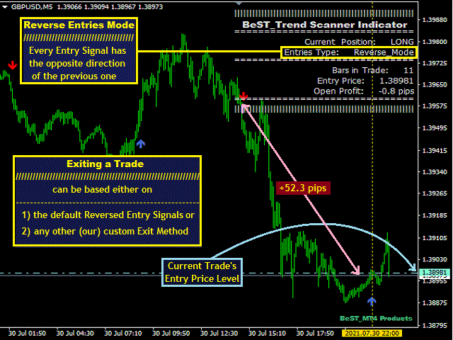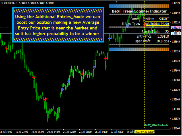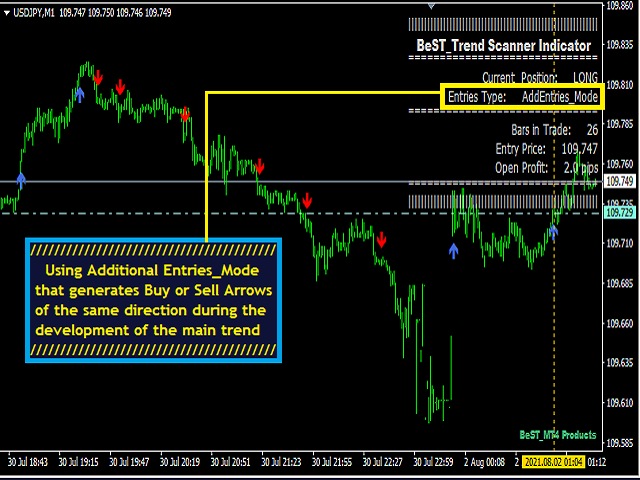 It generates Buy or Sell arrows at the very beginning of an Uptrend or Downtrend respectively when used at its Reverse Entries Mode while also- When used at its Additional Entries Mode :