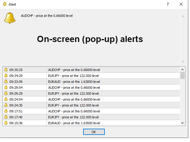 • 当价格达到整数水平时向您发送实时警报。支持所有 Metatrader 原生警报类型。