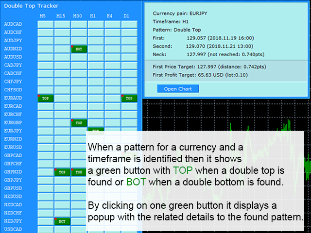 This indicator analyzes in parallel price charts for multiple currency pairs on all timeframes and notifies you as soon as a double tops or double bottoms pattern has been identified.