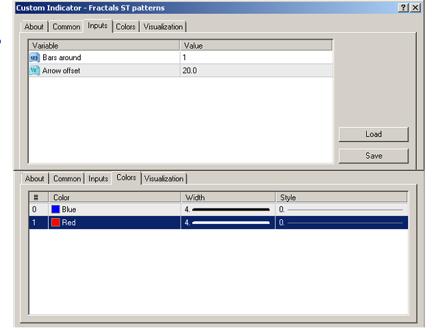 The fractal consists of a two sets of arrows - up (upper fractals) and down (lower fractals). Each fractal satisfies the following conditions: