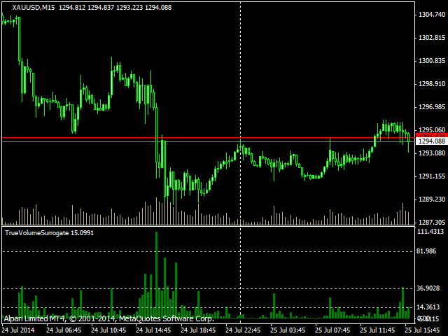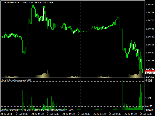 This indicator provides a true volume surrogate based on tick volumes. It uses a specific formula for calculation of a near to real estimation of trade volumes distribution , which may be very handy for instruments where only tick volumes are available. Please note that absolute values of the indicator do not correspond to any real volumes data, but the distribution itself, including overall shape and behavior, is similar to real volumes' shape and behavior of related instruments (for example, currency futures).