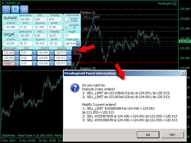The analyzer panel allows traders to add the pending order grid (Buy Limit, Sell Limit, Buy Stop, Sell Stop) quickly and efficiently.