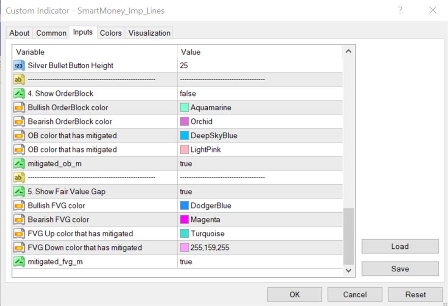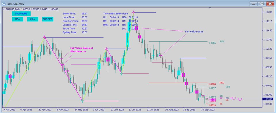 - Options to choose and change color settings for OrderBlocks, and Fair Value Gaps.