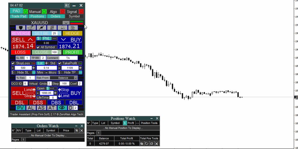 It contains four major utilities: ZeroRisk Trade Pad to open and manage trades, ZeroRisk Manual Trader , a ssistant for manual traders to control the trading plan and prop firm rules, ZeroRisk Algo Trader , assistant for algo traders to control and monitor EAs and ZeroRisk Telegram Signal Provider to send manual or EA signal to telegram.