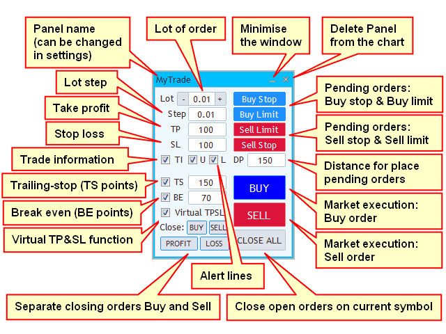 The new version of the trading panel, which now has the ability to separately close Buy and Sell orders, display targets for all orders on the chart, as well as the ability to use the panel to trade with brokers working on the FIFO rule. Also, the new version adds option buttons for separate management of open orders.