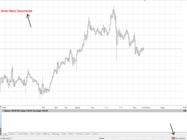 If you lost connection to your broker but your internet connection still connected, you will receive a sound, push, email notification and red blinking background, but if you lost the internet connection, the indicator will only alert you by sound and red background blinking.