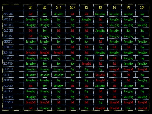 MACD MTF Indicator visualize all MT4 time frame  and trend based on  Moving Average Convergence Divergence (MACD) strategy . Indicator have settings for MACD customizing and variable "Symbols "EURUSD,USDCHG,...", which is used to define symbols. , Signals are displayed Buy , Strong buy , Sell, Strong Sell, ### - No Trend Strong