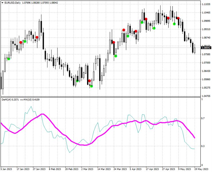 This indicator displays the moment when the DeMarker oscillator crosses its smoothed value.