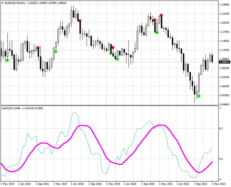 If the DeMarker oscillator crosses its smoothed value, it is a signal of a trend change.