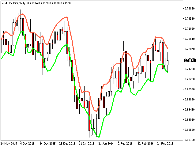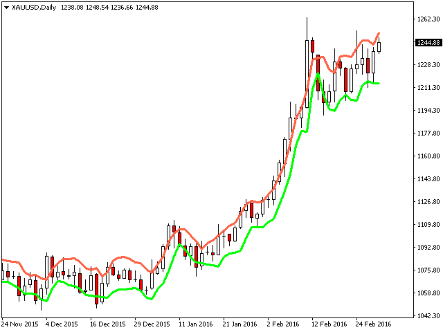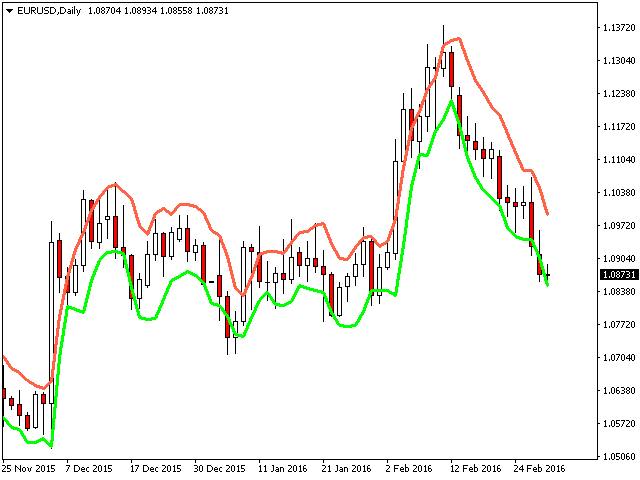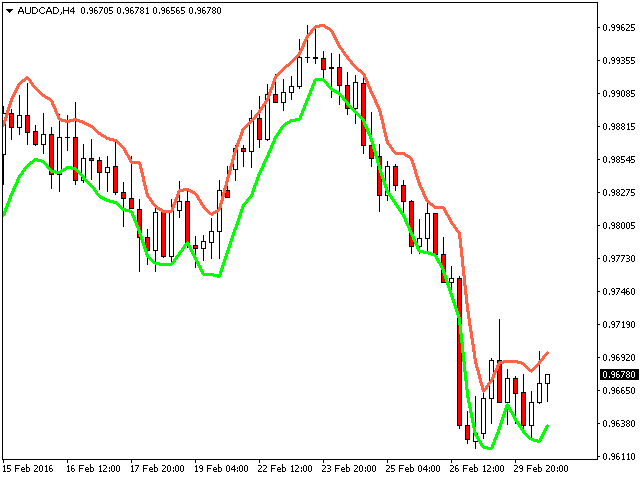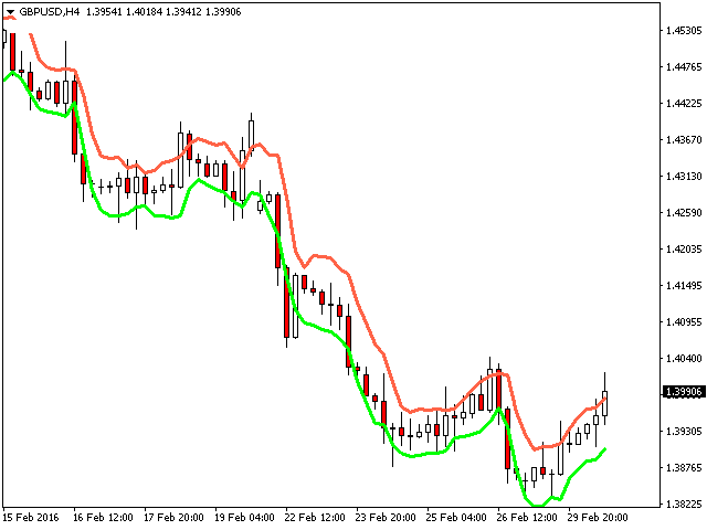The indicator is calculated using a three-day moving average of the last two true highs minus ATR to derive the lower channel and a three-day moving average of the last two true lows plus ATR to derive the lower channel.