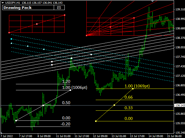 This indicator provides several drawing tools to assist in various methods of chart analysis.